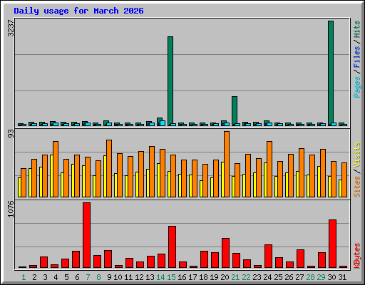 | Day | Hits | Files | Pages | Visits | Sites | KBytes | ||||||